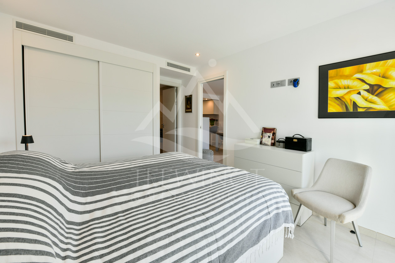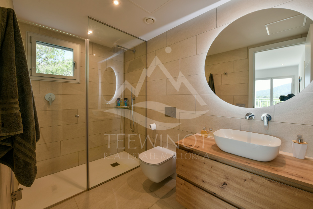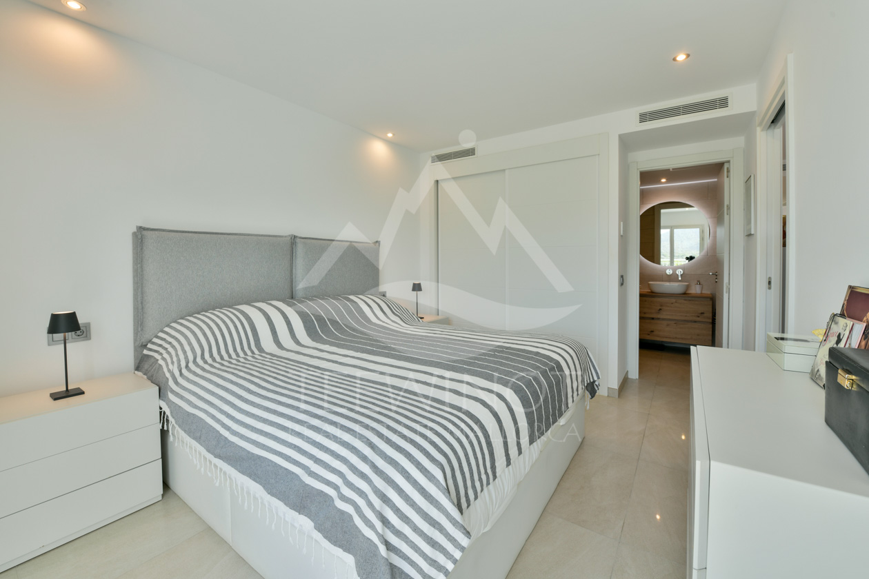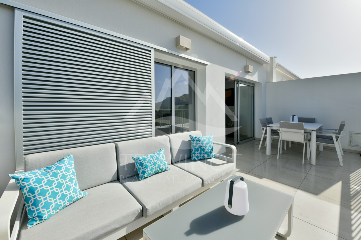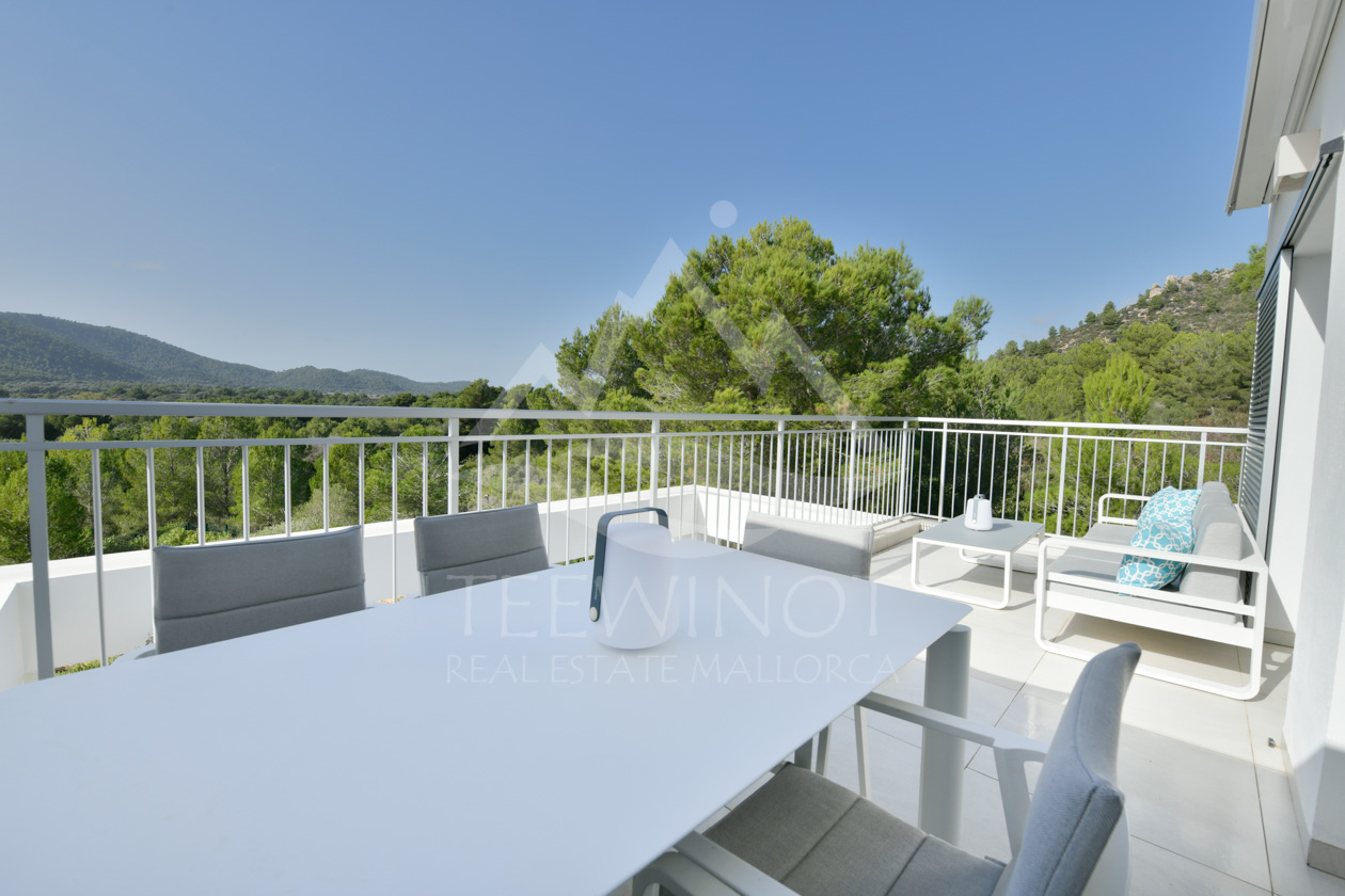 Im Inneren erwartet Sie ein großzügiger Grundriss mit drei Schlafzimmern und zwei eleganten Badezimmern, eines davon en-suite. Der offene Wohn- und Essbereich mit vorgelagerter Terrasse und elektrischer Markise öffnet sich zu einem herrlichen Panoramablick und sorgt für ein harmonisches Wohngefühl mit mediterranem Flair.