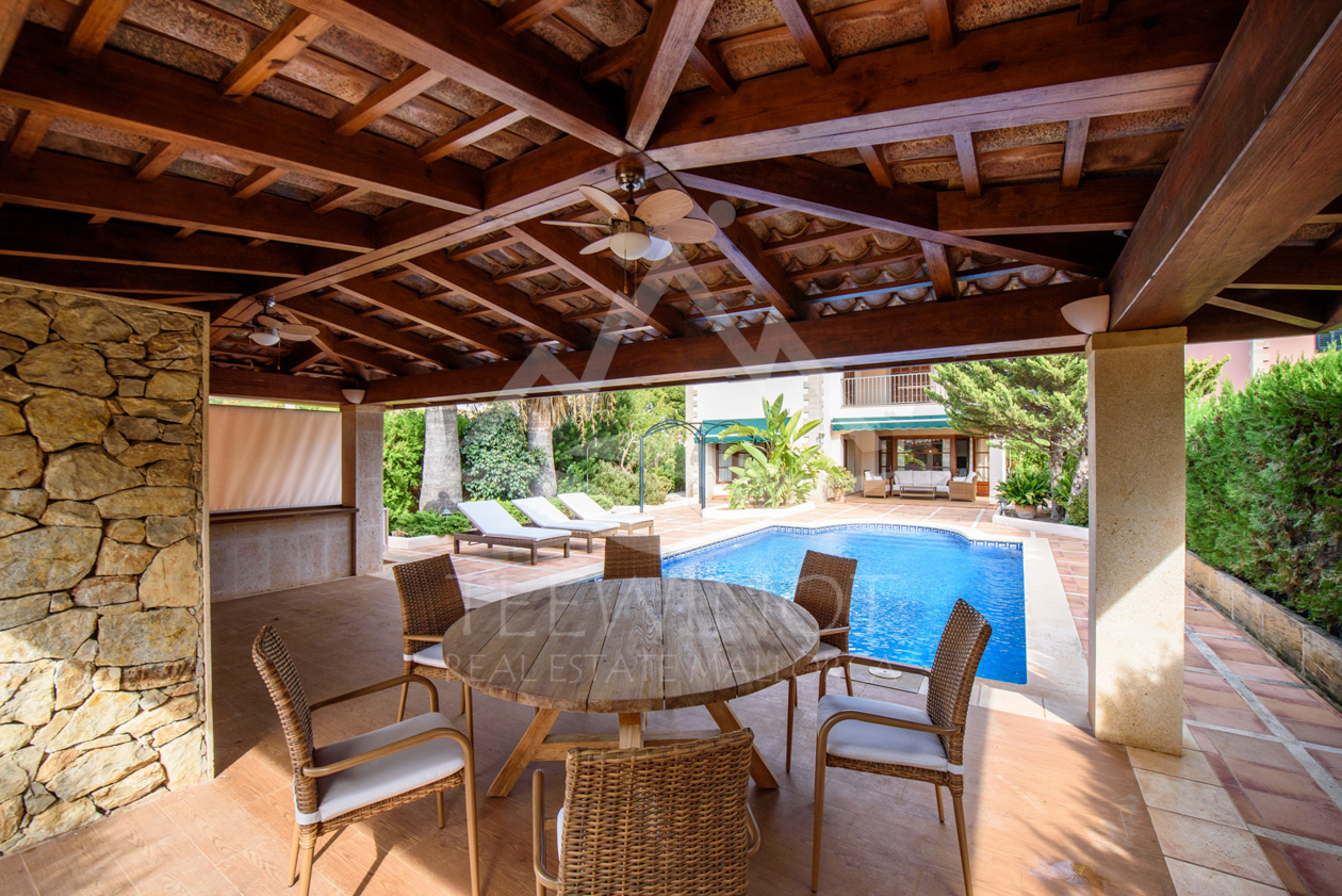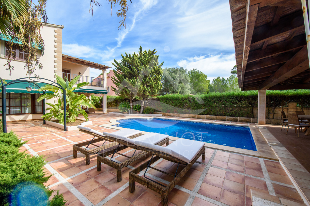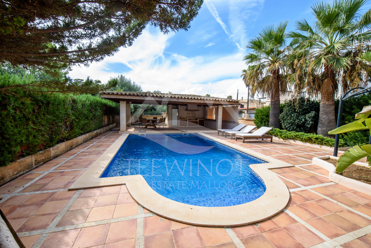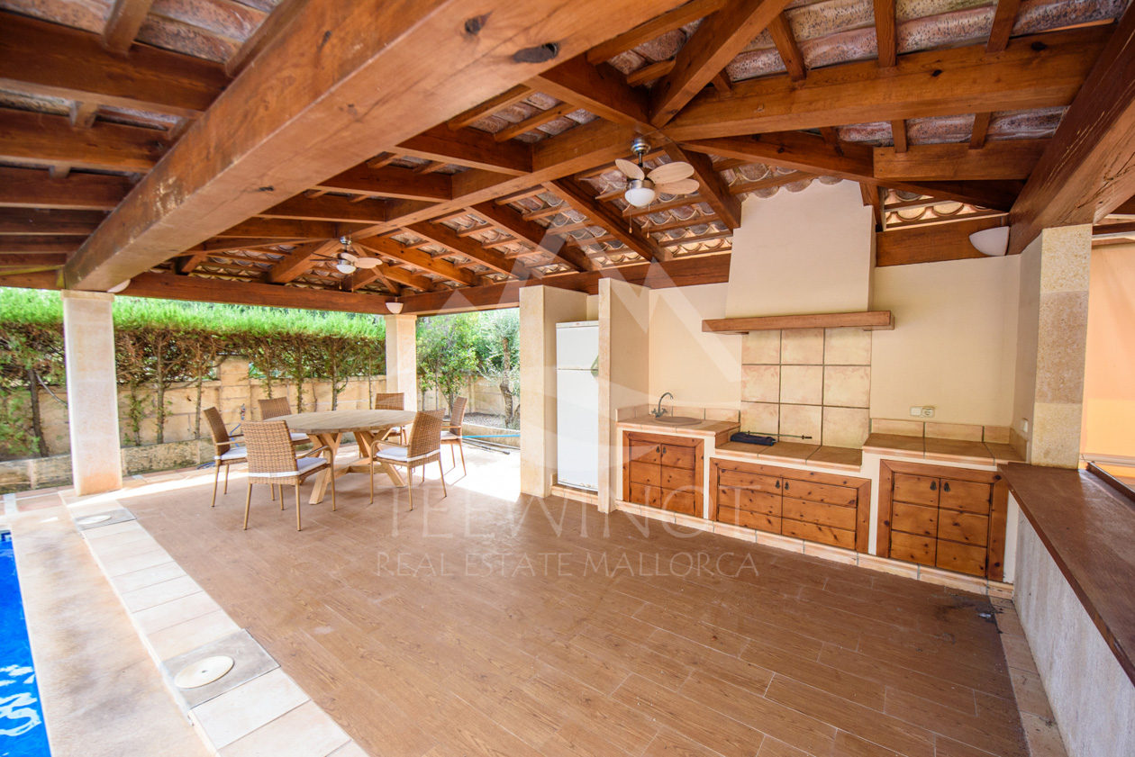 Der Außenbereich ist perfekt für das mediterrane Leben auf Mallorca gestaltet. Der große Pool wird von weitläufigen Sonnenterrassen umgeben und lädt zum Entspannen ein. Ein besonderes Highlight ist die große Sommerküche mit überdachtem Sitzbereich, ideal für gesellige Abende mit Familie und Freunden.