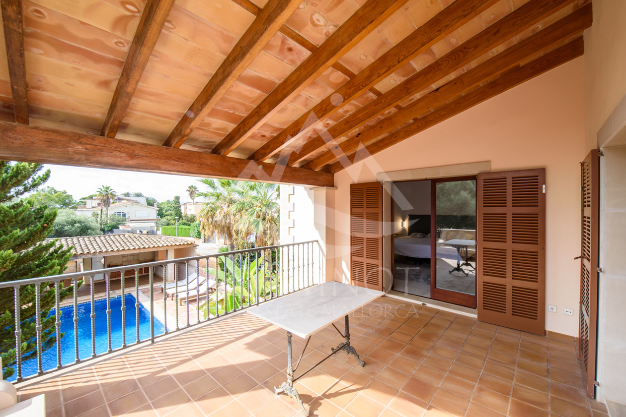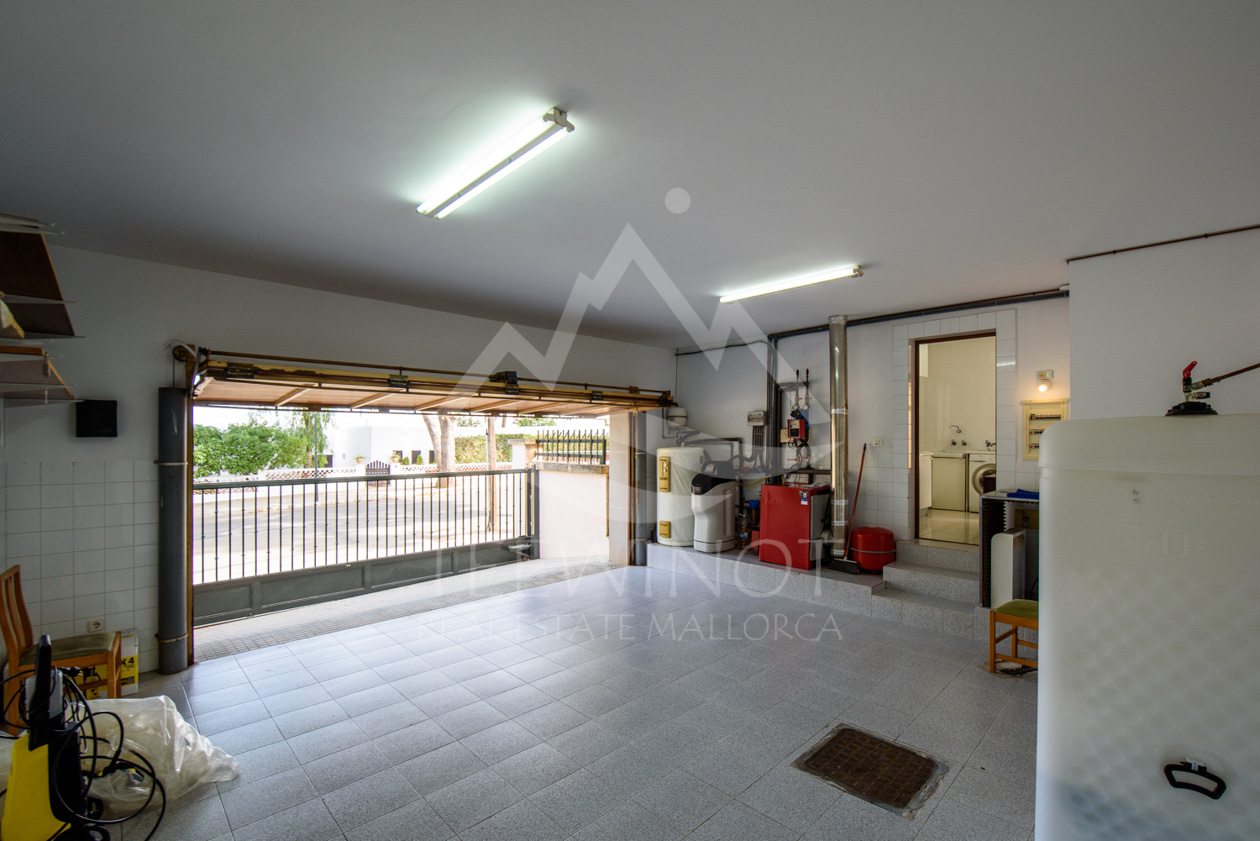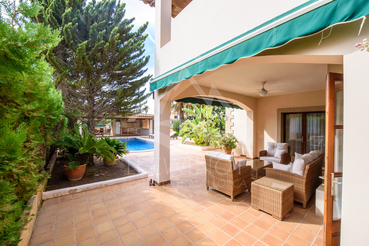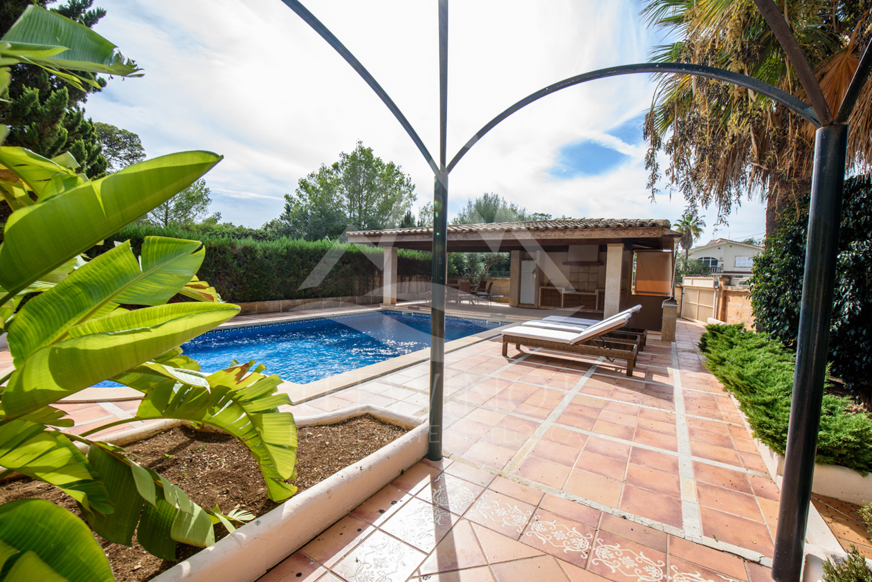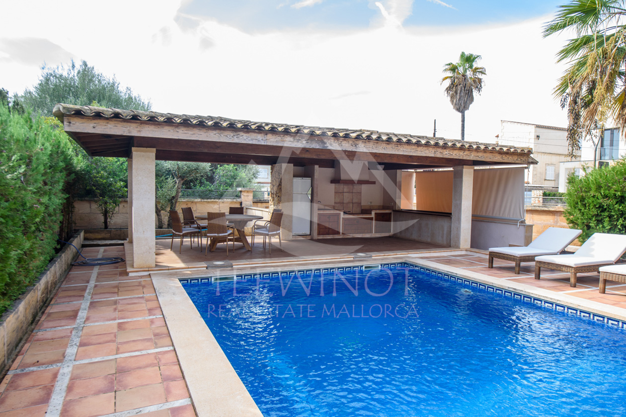 Der Außenbereich ist perfekt für das mediterrane Leben auf Mallorca gestaltet. Der große Pool wird von weitläufigen Sonnenterrassen umgeben und lädt zum Entspannen ein. Ein besonderes Highlight ist die große Sommerküche mit überdachtem Sitzbereich, ideal für gesellige Abende mit Familie und Freunden.
