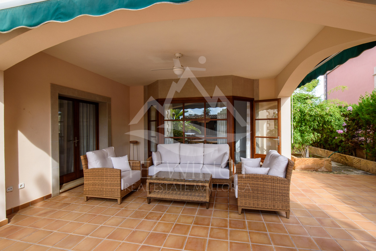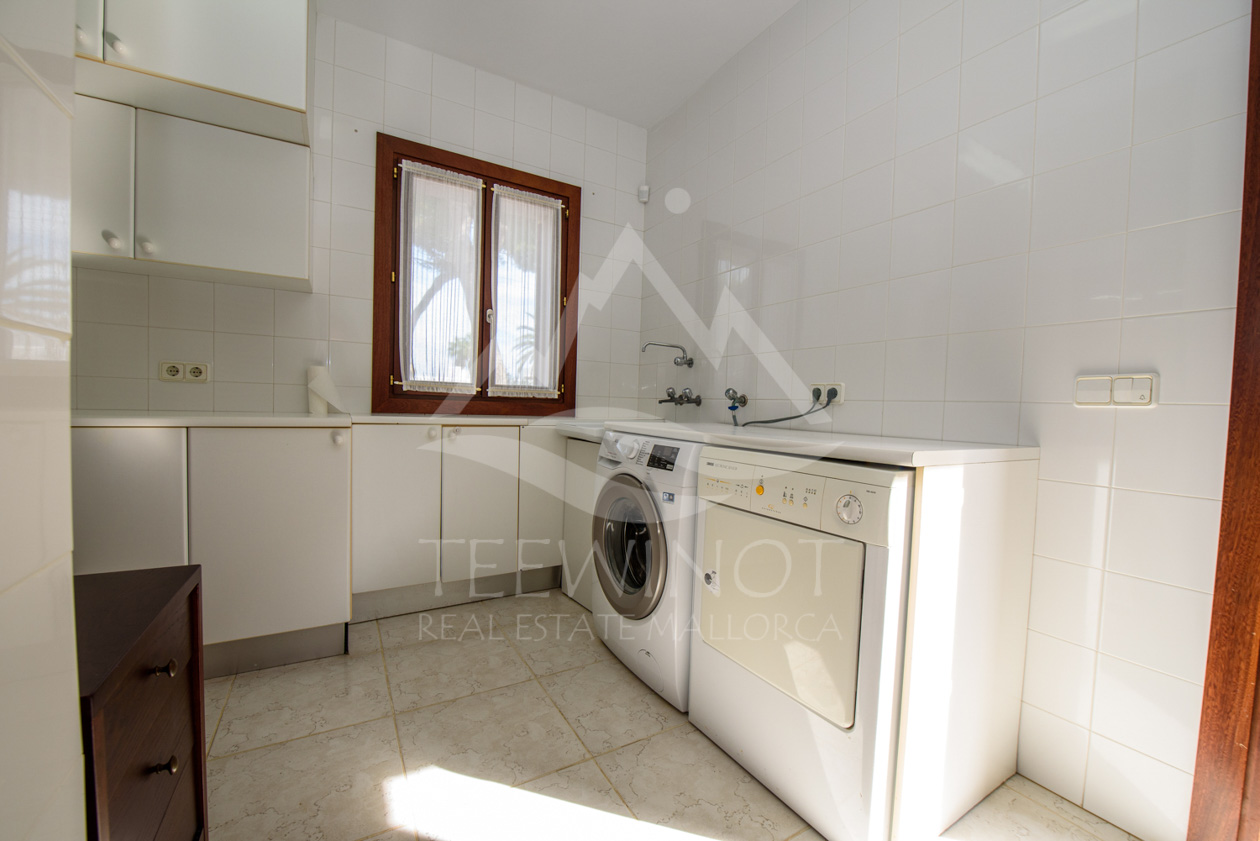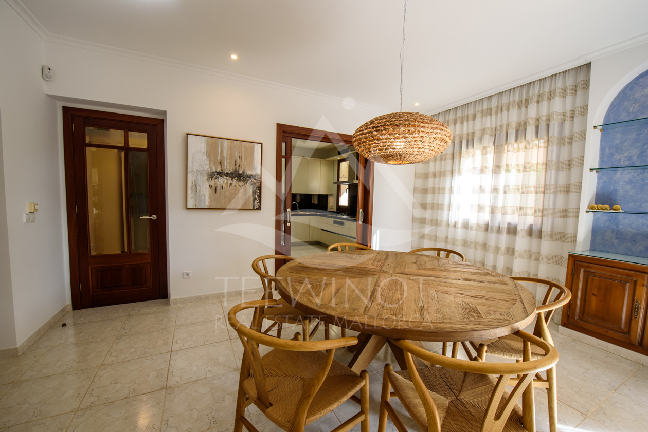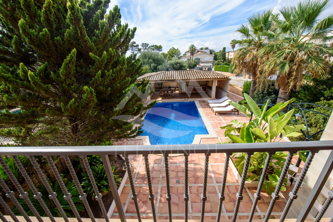Der Außenbereich ist perfekt für das mediterrane Leben auf Mallorca gestaltet. Der große Pool wird von weitläufigen Sonnenterrassen umgeben und lädt zum Entspannen ein. Ein besonderes Highlight ist die große Sommerküche mit überdachtem Sitzbereich, ideal für gesellige Abende mit Familie und Freunden.